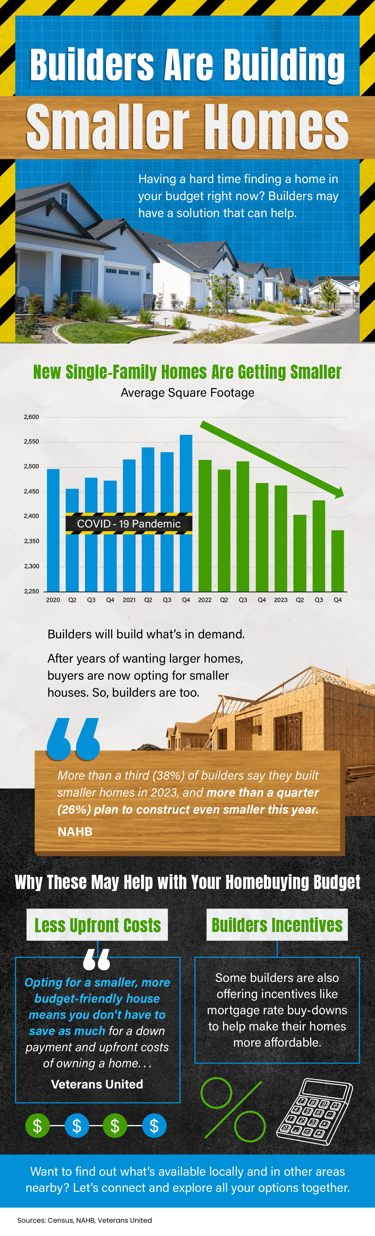 Having a hard time finding a home in your budget? Builders may have a solution that can help. Builders are shifting their attention to what buyers want most right now - smaller, more affordable homes. If you want to see what's available locally and in other areas nearby, let's connect and explore your options together.