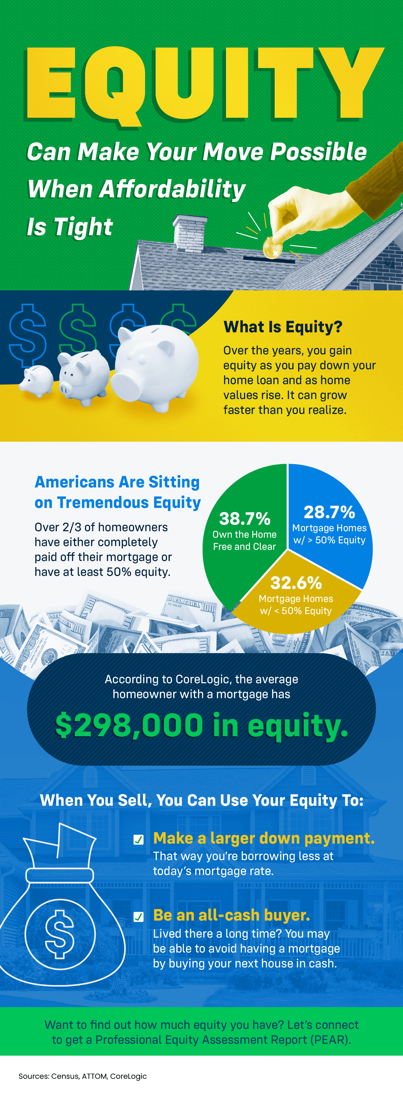 Did you know the equity you have in your current house can help make your move possible? Once you sell, you can use it for a larger down payment on your next home, so you’re borrowing less. Or, you may even have enough to be an all-cash buyer. The typical homeowner has $298,000 in equity. If you want to find out how much you have, let’s connect for a Professional Equity Assessment Report.