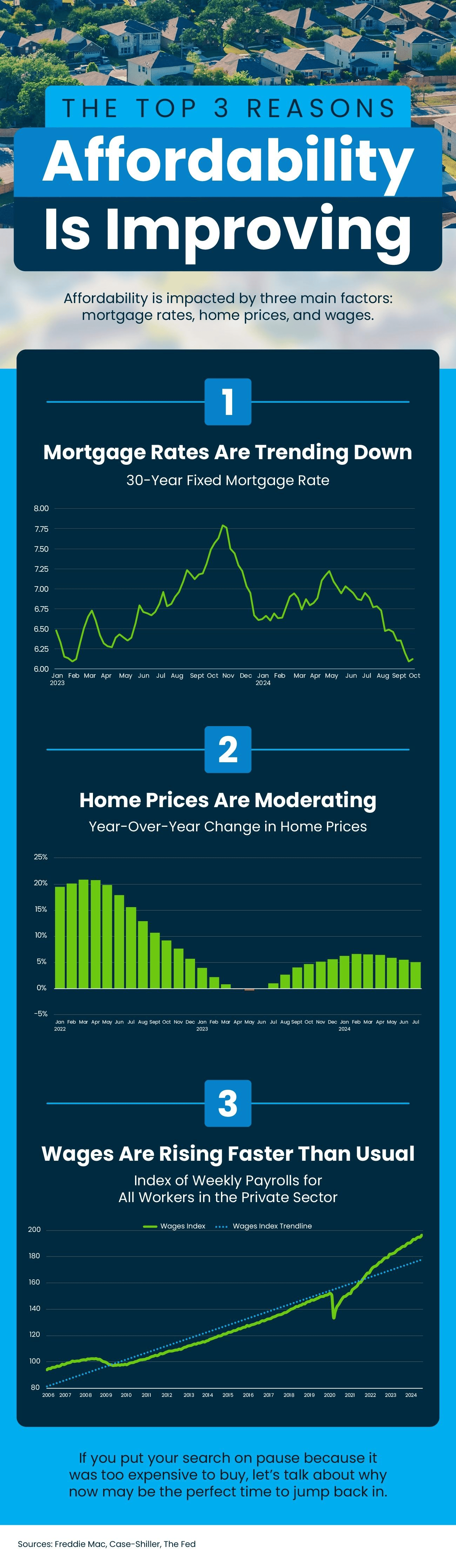 Affordability is based on three key factors: mortgage rates, home prices, and wages. And today, it’s improving quickly as rates come down, prices level off, and wages climb. If you put your search on pause because it was too expensive to buy, let’s talk about why now may be the perfect time to jump back in.